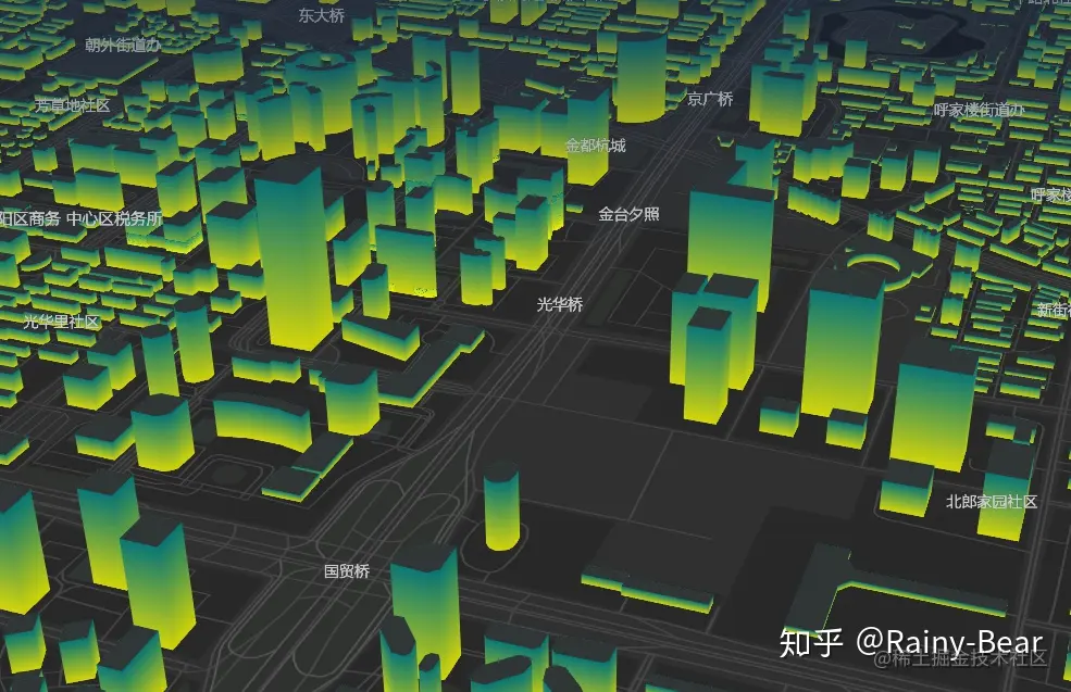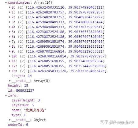 上图“建筑数据”中,数组中的每一项都是一个独立的建筑相关信息的描述。coordinates 描述了建筑在地面上投影的顶点的经纬度坐标;height 描述的是建筑的高度;id 是建筑的编号,在替换精细模型时会用到;info 描述的是其他相关信息。有了 coordinates 和 height 就足够渲染出建筑模型了。
