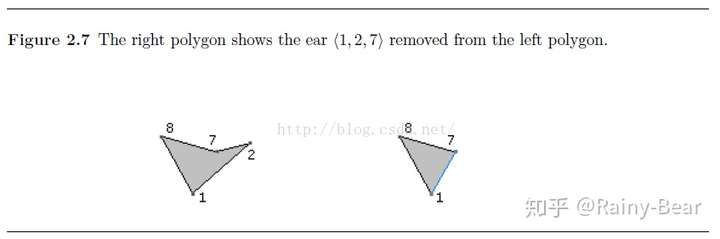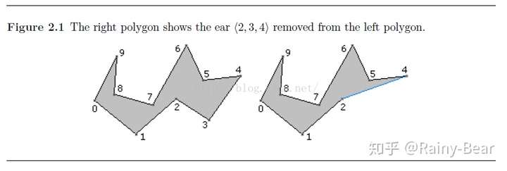 下面简单介绍一下耳切法的思路。顾名思义,得先知道“耳朵”是啥,才能去切。简单多边形的耳朵,是指由连续顶点 V0, V1 和 V2 组成的内部不包含其他任意顶点的三角形。在计算机几何术语中,V0 与 V2 之间的连线称之为多边形的对角线,点 V1 称之为耳尖。虽然可以将耳尖放到三角形的任意一个顶点上,但是我们定义三角形只包含一个耳尖。一个由四个顶点(或者更多)组成的多变形至少有两个不重叠的耳尖。这个特性提供了一个通过递归来完成三角分割的方法。针对由 N 个定点组成的多边形,找到它的耳朵,移除耳尖,此时剩余顶点组成了一个 N-1 个顶点的简单多边形。重复这个操作直到剩余三个顶点。