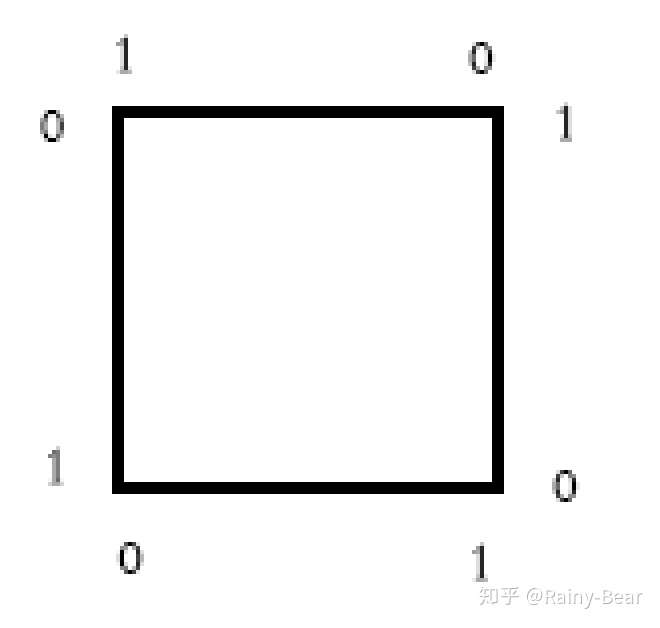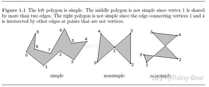 首先定义什么是简单多边形,简单多边形是由一组有序顶点组成的,例如:点 V0 ~ 点 Vn-1。相邻的顶点之间通过边( Vi, Vi-1 )连接,并且边(Vn-1, V0)连接起始点。每个顶点被两条边所共享,而边的所有交点都是顶点。下图中,左边的多边形是简单多边形,中间的多边形点 1 被四条边共享,不符合定义的条件,不算是简单多边形,右侧的多边形中边 1-4,边 0-2 的交点不是我们定义的顶点之一,因此该图形也不符合简单多边形的定义。