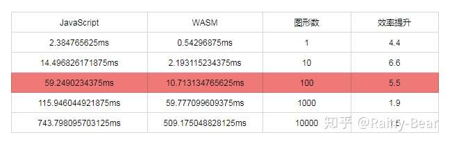 对于一次性加载一屏的建筑物,大约 100 级别的图形数,每个图形以 100 个顶点为例,WASM 相对于 JS 平均提效 5.5 倍左右。