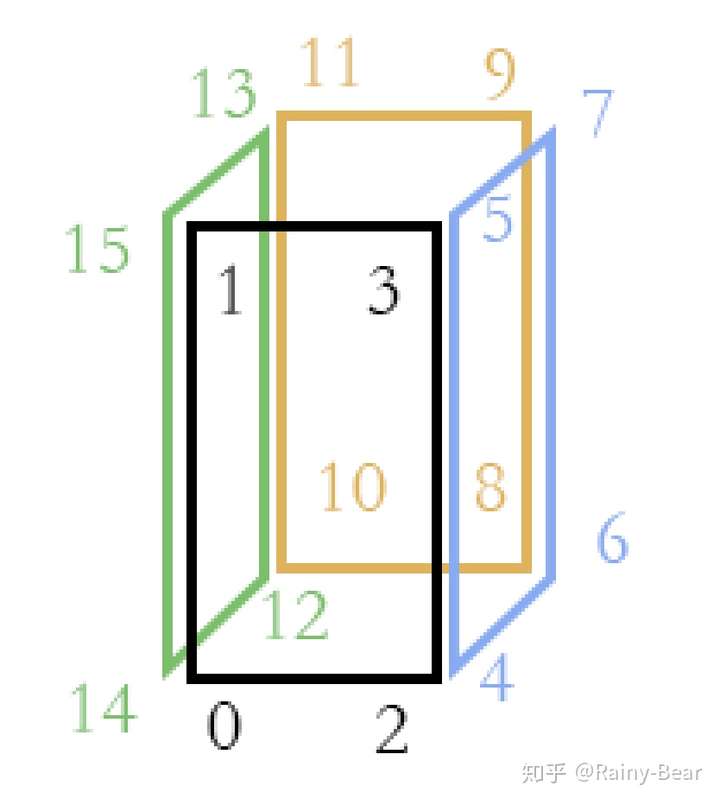 每个侧面,由两个三角形面片构成,具有 4 个顶点,每个顶点,除了顶点坐标外,还有一个类型为 vec2 的 uv 属性: