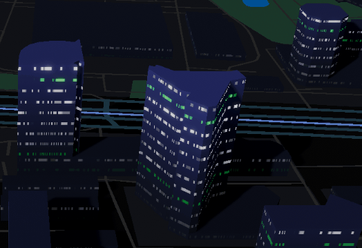 建筑整体半透明效果,根据高度填充渐变色,边缘高光。另外在高层建筑顶部加入额外的高光线。