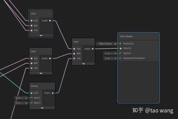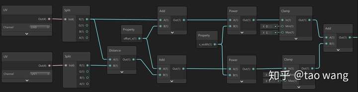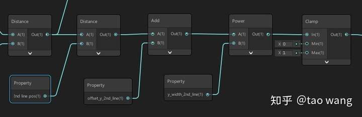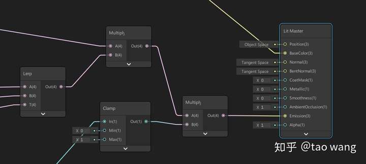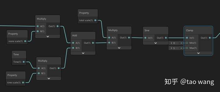 最后就是 Time 节点的部分,计算很简单。同样为了调整方便,我们提供了很多输入值来控制最终取值的变化范围。将这个值取一个 Sine,获得一个变化的曲线。然后截取到 0到1之间。