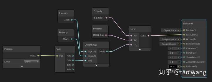 下一步我们来指定 Color 的输入。我们直接取模型的世界坐标的 y,在两个输入高度值之间做Smoothstep,然后作为两个输入的颜色值 Lerp 的参数,实现建筑在高度方向上的渐变色。