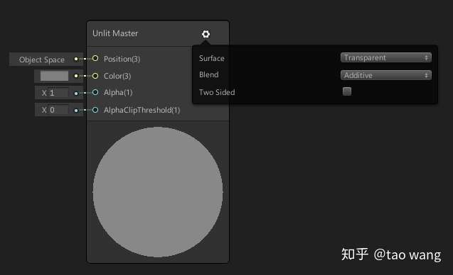 首先,我们创建一个Unlit Mater节点,选择 Additive 的混合模式。我们的颜色将会和和目标颜色求和,实现半透明效果。