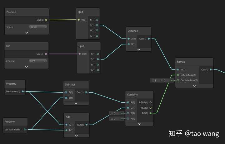 为了方便控制,我们加入两个控制节点,bar center 和 bar half width来控制楼层高度和偏移。使用世界坐标的 y 值 和 UV2 上保存的建筑总高度求差取得距楼顶的距离,通过前面的控制变量进行 Remap,获得多个取值间隔为 1 区间。