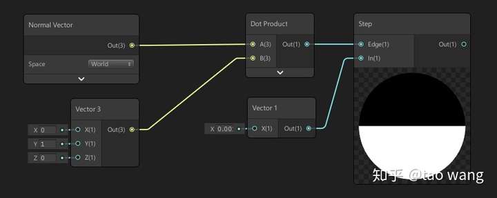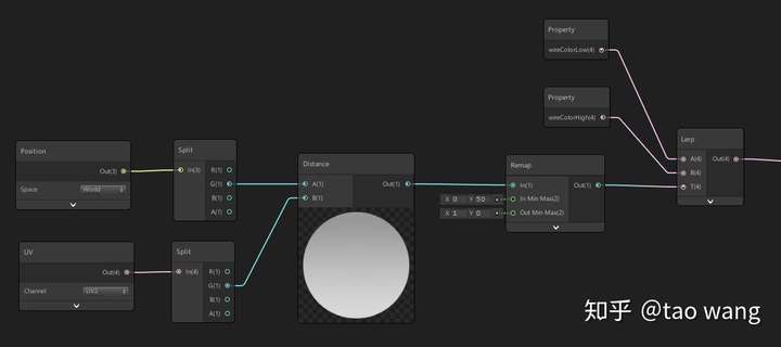 最终,我们使用前面三个模块的计算结果来做颜色混合。使用边过滤模块的值作为 Lerp 的参数,在面颜色和边颜色之间插值,就可以得到最终混合的颜色,传给 Master 节点的 Color,就可以得到我们最终的颜色了。