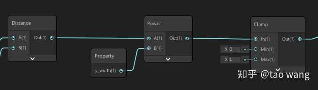 取到距离,我们对这个距离取一个 -a 次方( a > 0 ),-a次方在 x 轴正方向有很好的下降曲线,取值随着高度下降迅速衰减,可以实现顶部线的高亮变化。a 值也作为一个输入值,调整参数可以控制高亮范围。