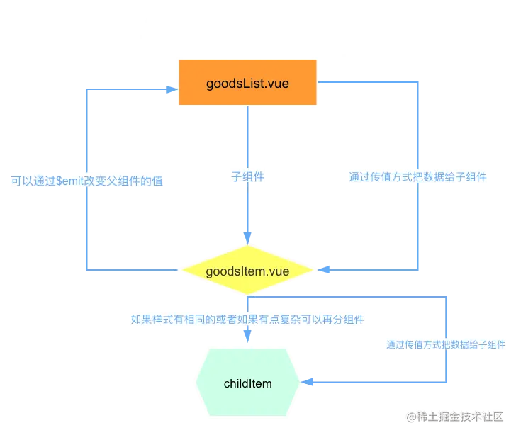 组件传值:组件传值一般都是props,如果是项目过大或者数据过大可以用vuex。详情vuex模块化