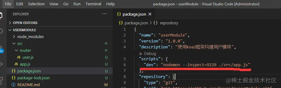 回到项目根目录,打开命令行工具运行npm run dev就可以成功启动项目了.此时打开浏览器访问接口地址可以看到数据返回.