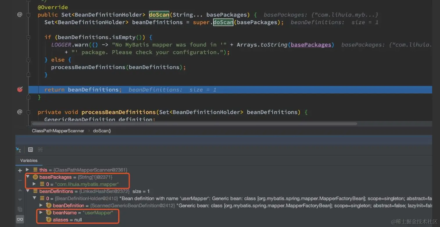 DEBUG一下,可以看到这个就是扫描Mapper接口的方法,返回@MapperScan注解的value