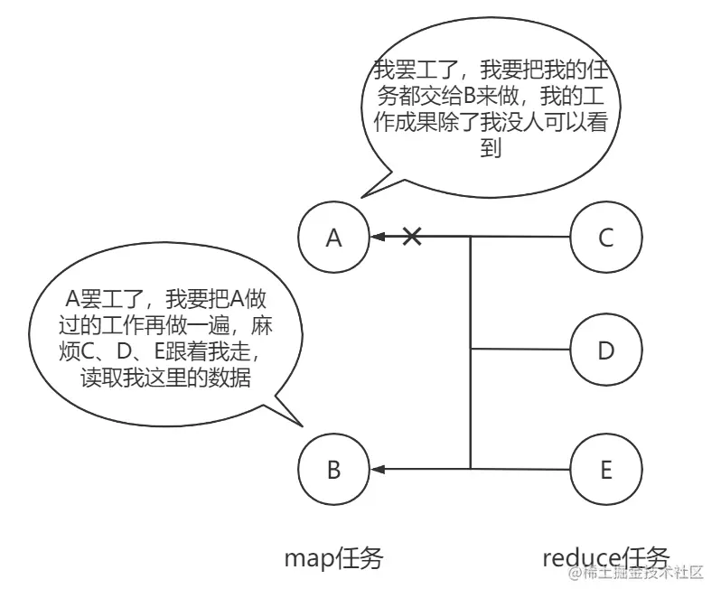 假设有worker A和worker B,worker A工作到一般崩溃了,worker A的任务由worker B来接手。此时worker A的map任务生成的中间结果集是存储在worker A本地的,但由于worker A已经崩溃无法访问,所以worker B需要重新执行worker A已经执行过的map任务来生成中间结果集,并且通知其他的执行reduce的worker不要再读取worker A的数据了,都来读取worker B的数据;而如果是worker A的reduce任务,由于生成的输出集已经存储到全局的文件系统,所以无需再次执行。