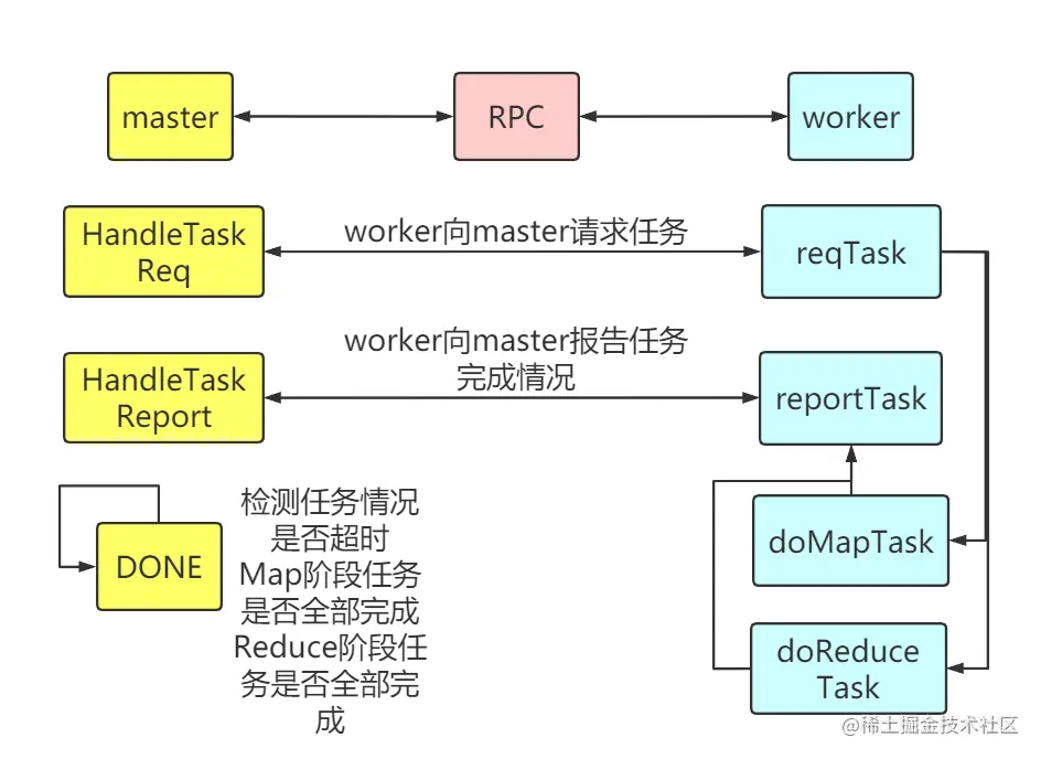在运行过程中,master既然给worker分配了任务,就会想要了解到worker们的工作情况,所以master会周期性地ping每一个worker。如果在一个时间段内没有收到worker的反馈,那么就会判定该worker失效了。而之前已经安排给这个worker的任务呢,则判定为没有完成,置为初始的空闲状态,可以分配给其他的worker去处理。