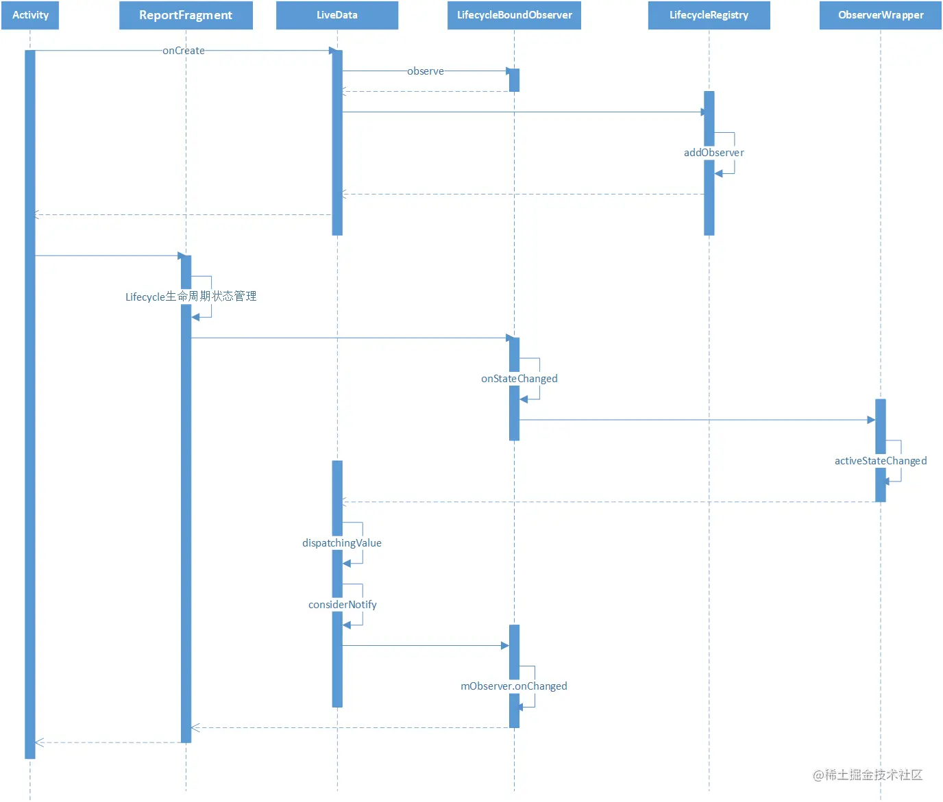 这里注意一下,在Acitivity的onCreate中执行完 LiveData.observe 后,会将观察者包装一下,然后添加到观察者集合中,注入ReportFrament,执行onActivityCreate方法,然后开始分发Lifecycle.Event.ON_CREATE事件,然后ON_START、ON_RESUME事件,界面显示完毕。