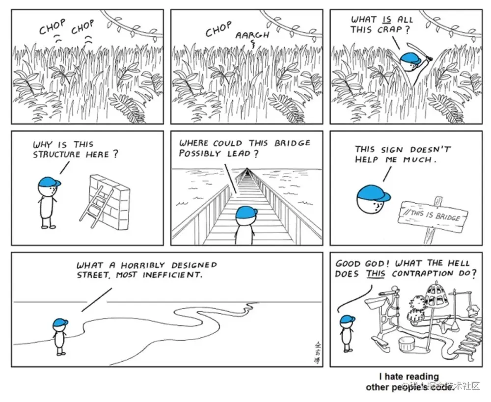 因为在看之前,你真的不知道对方是干净可爱的小黄鸭,还是染着黄色的 hello kitty,又或者根本就是一个奇怪的哥特式黑洞。上面的比喻可能有点夸张,但不可否认,大部分情况下直接去阅读别人的代码是事倍功半的。往大里讲,如果一个团队一起去看前人写的代码,甚至是劳民伤财。(我要不是见过,我会胡说?)