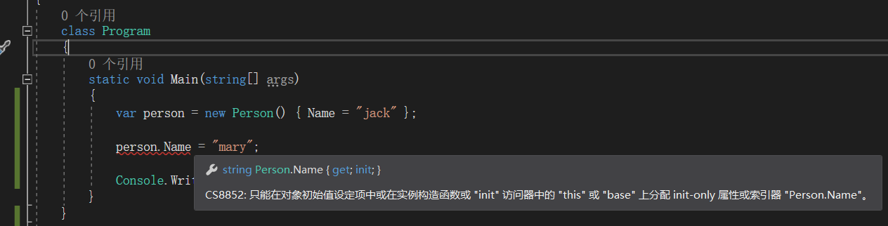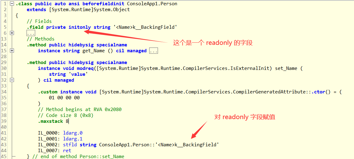 上面这张图就已经很清晰的解释了,原来 init 就是自动生成了一个对 私有只读字段 的封装,对于 readonly 相信大家已经轻车熟路了,它的初始化只有两种方式:声明时和构造函数中,但从 C# 9 开始就多了一个属性赋值方式,也就是说现在有三种赋值方式了,还原代码如下: