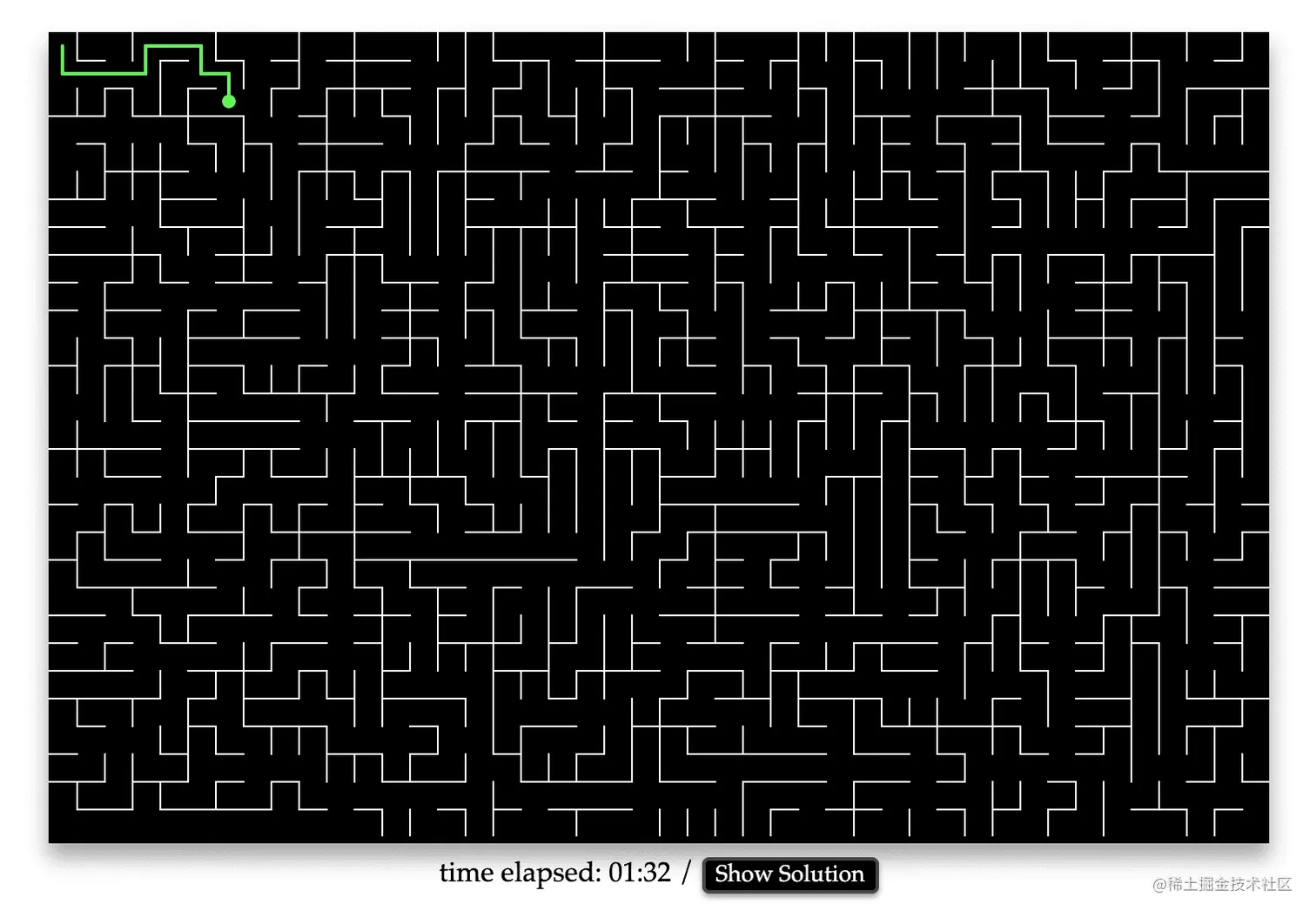 16、MazeBattles.com:使用 Node.js 和 Socket.io 实现的在线迷宫游戏。入口在左上角出口在右下角,通过 [a][w][s][d] 按键移动位置。支持多人和单人两种模式,点击 “Show Solution” 可展示迷宫的解(BFS 算法实现)。在线试玩