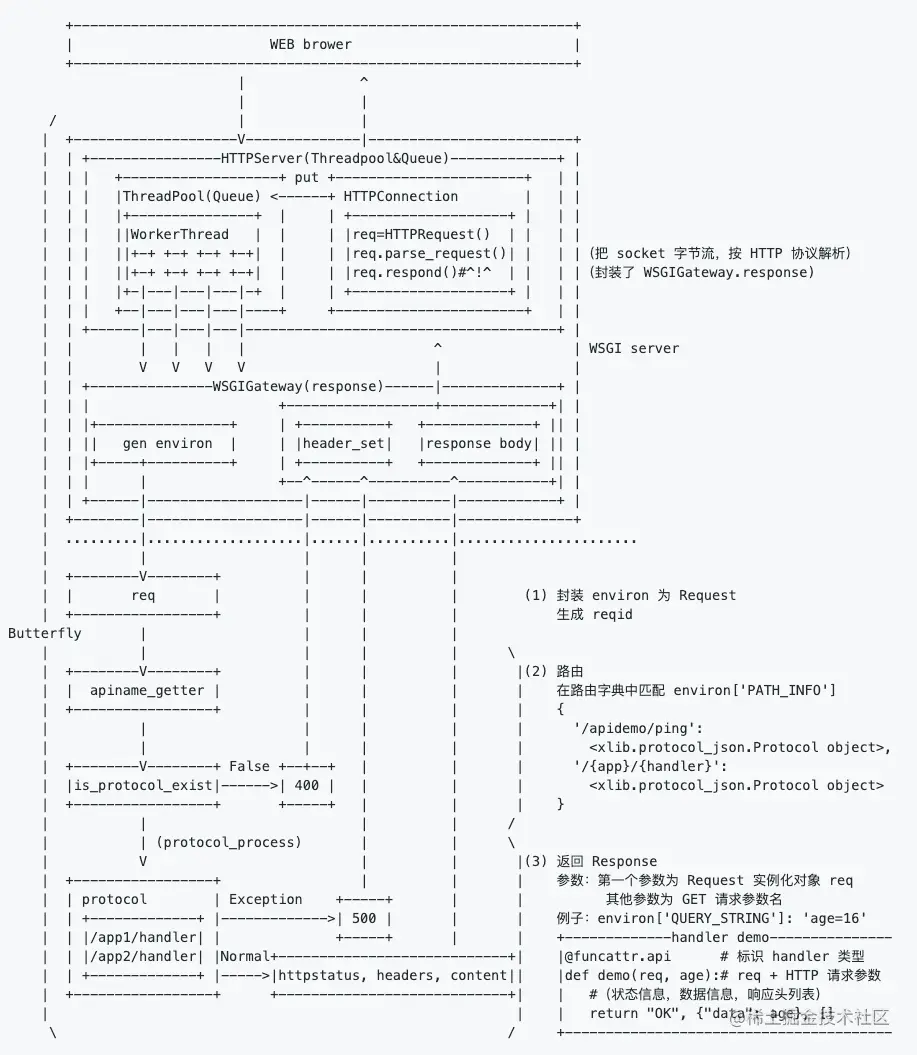 23、butterfly:又一个轻量级的 Python Web 框架。Web 框架太多了,该项目主旨是通过开发一个轻量级、可靠可用的 Web 框架,来更加深入理解 Web 开发过程中经常忽略(框架做的)但又十分重要的知识点。那句话咋说来的:我不做一遍,我就不算懂!架构图如下: