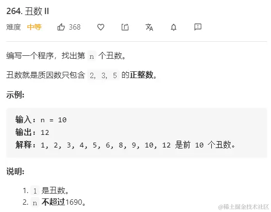 因为丑数的因子只有2,3,5,所以我们可以用三指针指向当前最大的三个丑数,下一个丑数必然是当前最大的三个丑数×2、×3、×5得到的三个数中 最小的那一个。 得到新的丑数之后,做了乘法的那个指针就往前移动,这样三个指针时刻指向最大的三个丑数。