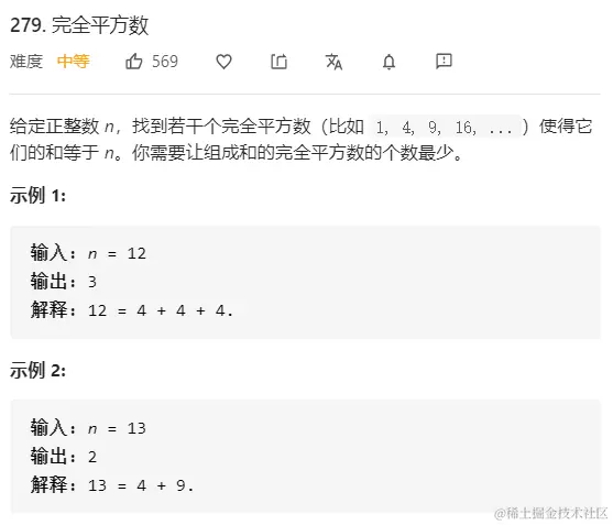用dp[i]表示组成i的最少的完全平方数的个数。 如果有一个j, 1<=j且jj <= i,如果j的平方是组成i的完全平方数的其中之一个完全平方数,则可以考虑用dp[i - j * j]来更新dp[i]。 即dp[i] = min(dp[i], dp[i - j * j] + 1); 表示组成i的最少的完全平方数的方案是组成i-jj的最少的完全平方数的方案加上j的平方。 i从小到大从1到n递推,不断更新dp[i]的值,最后返回dp[n]就是答案。