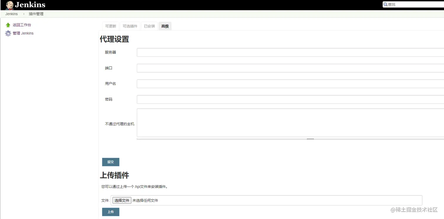 插件下载地址: updates.jenkins-ci.org/download/pl… 插件有版本依赖关系,选择所需要插件最好都是下载最新版本。上传插件,点击 manager jenkins -> manager plugins-高级-选择文件-submit ,