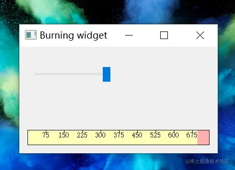 例子中,我们使用了 QSlider 和一个自定义组件,由进度条控制。显示 的有物体(也就是CD/DVD)的总容量和剩余容量。进度条的范围是 1~750。如果值达到了700(OVER_CAPACITY),就显示为红色,代 表了烧毁了的意思