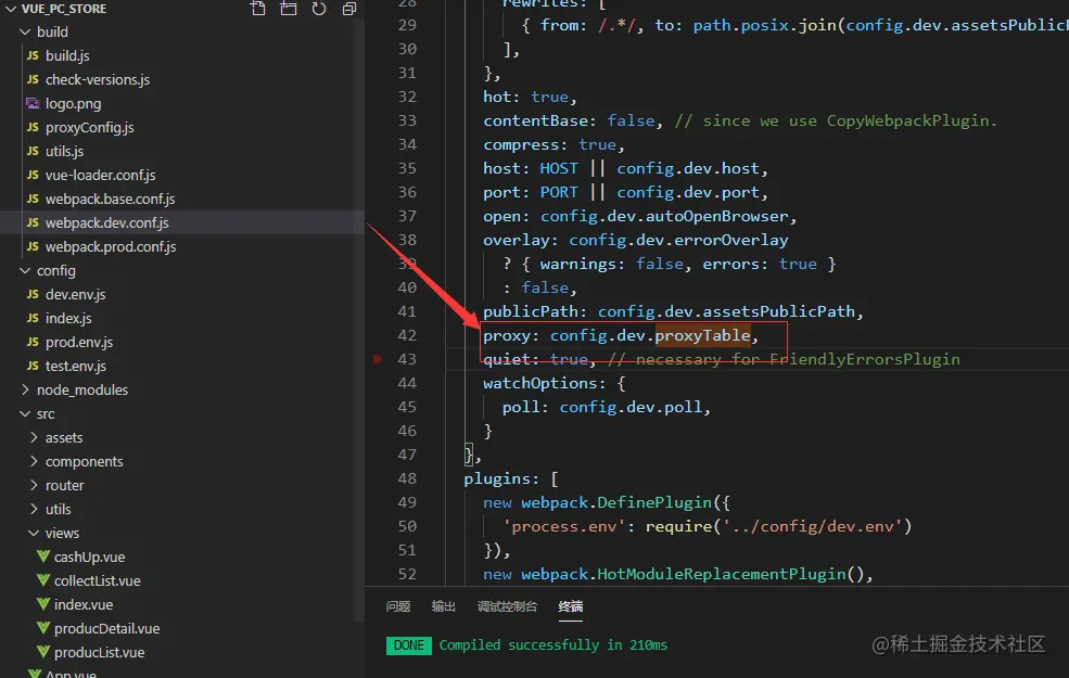 再来一下,开发前必要重大环节,本地代理。首先,本地代理,通常针对开发环境,那么我们的目标也明确了,即是webpack.dev.conf.js的中的proxy属性。我们在该文件的devServer,proxy属性,这里发现,他原来已经配置到config.dev.proxyTable去。而proxyTable默认为空。如下图: