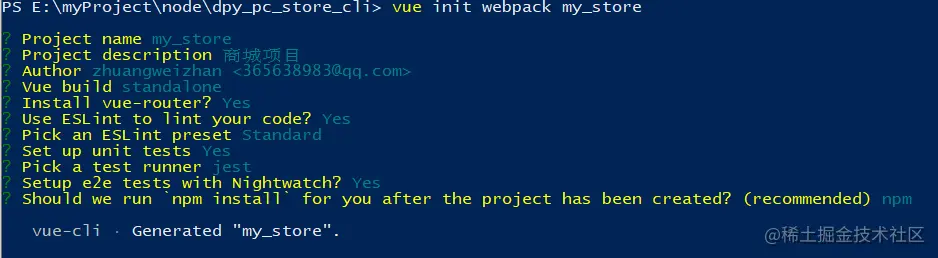 进入到对应项目地址,新建一个my_store目录:vue init webpack my_store