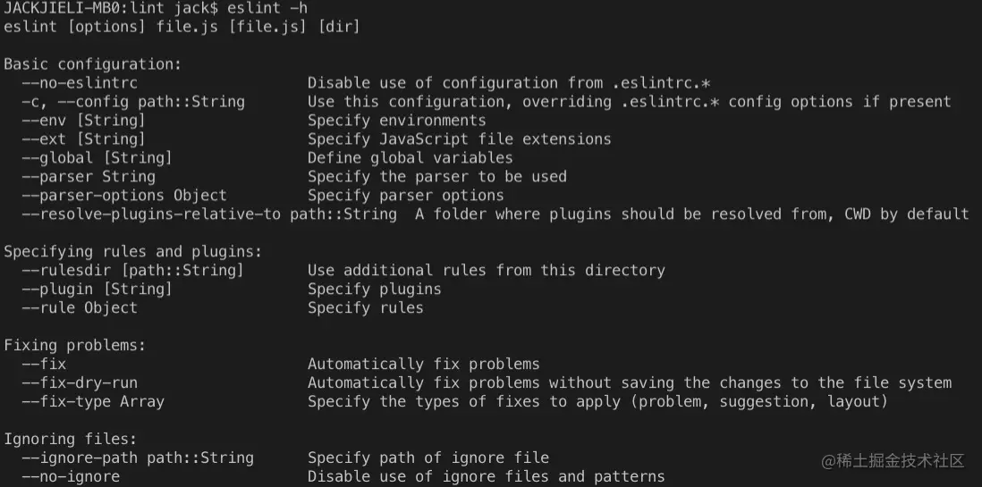 安装后可以在项目命令行使用 eslint -h 查看是否安装成功,安装成功后,该命令可以正常查看。