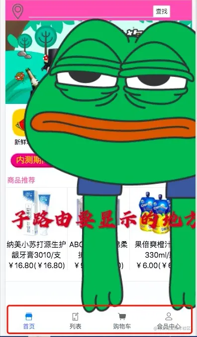 以我最近实战的项目为例子,我希望在首页上有个可以切换不同内容的footer组件,这些切换的内容就是作为首页的子路由,