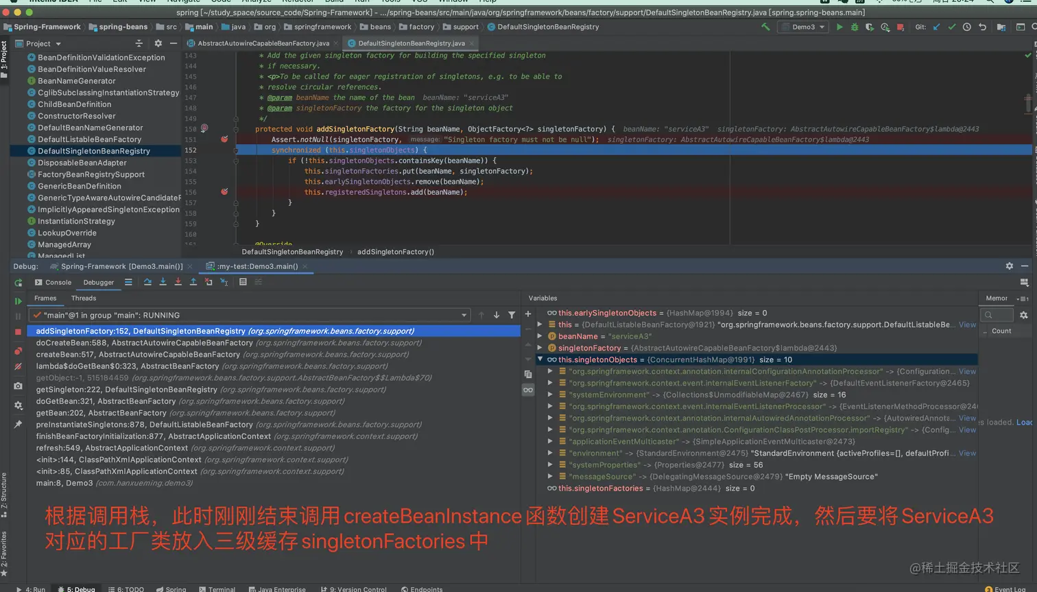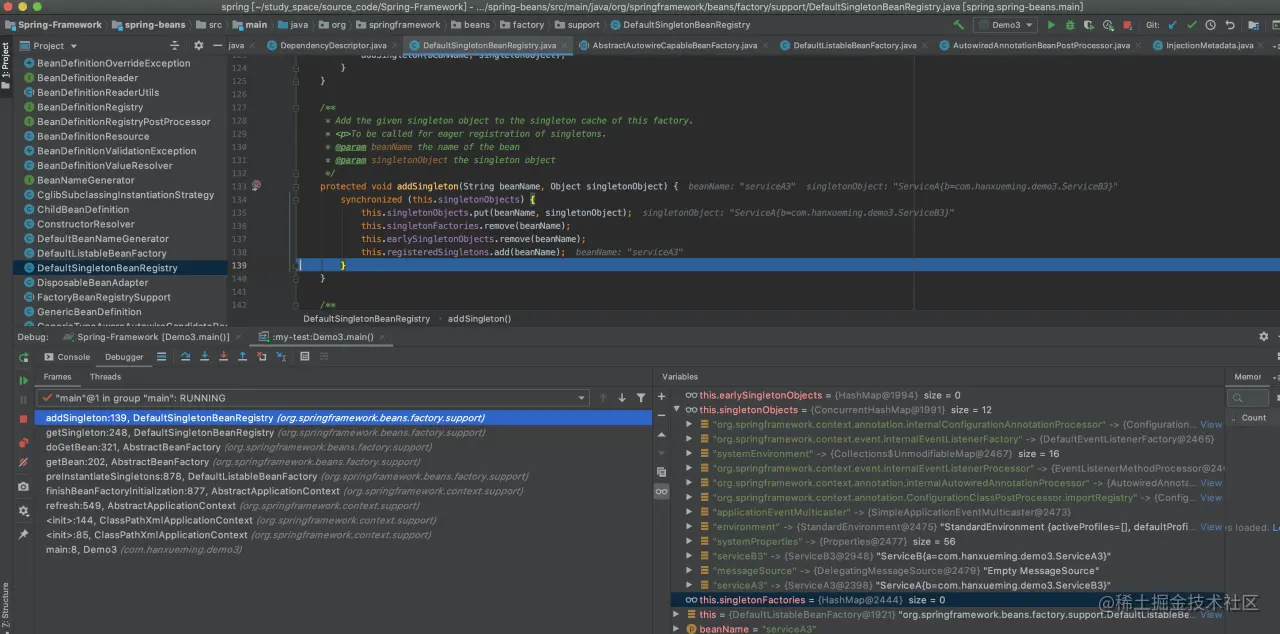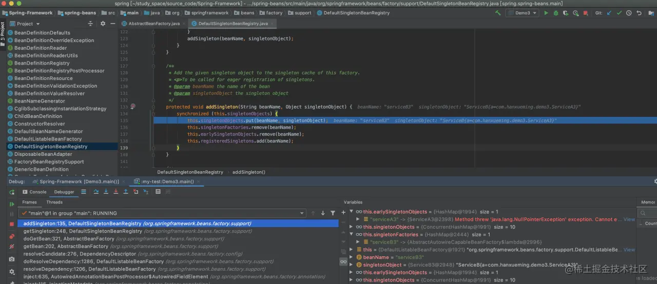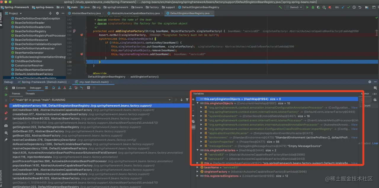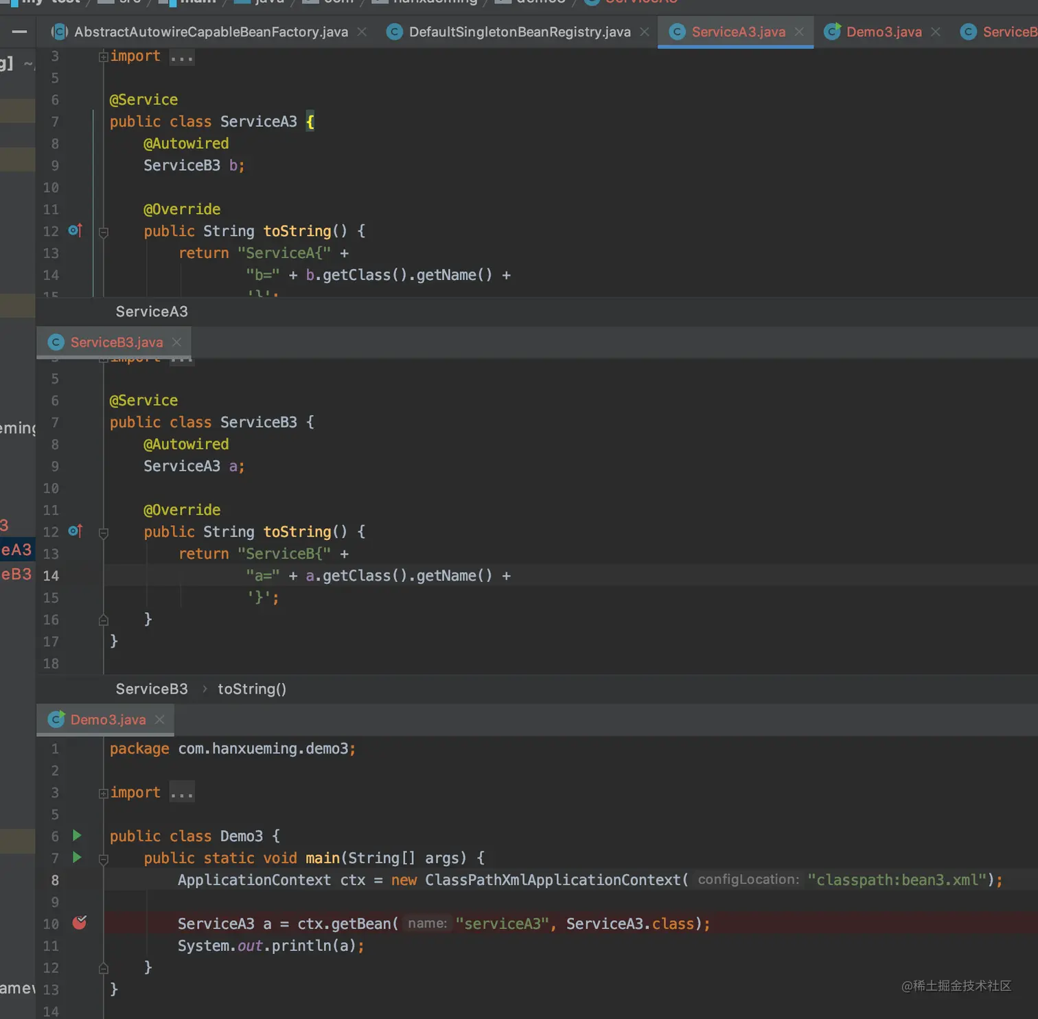 到这里,ServiceA3 和ServiceB3的实例已经成功创建,并放入到Spring的第三级缓存中,但是此时,还没有向ServiceA3 和 ServiceB3中注入属性。
