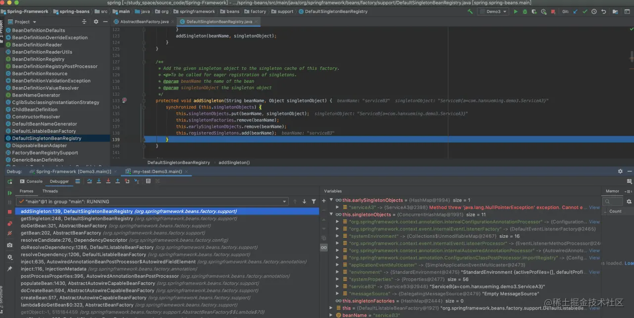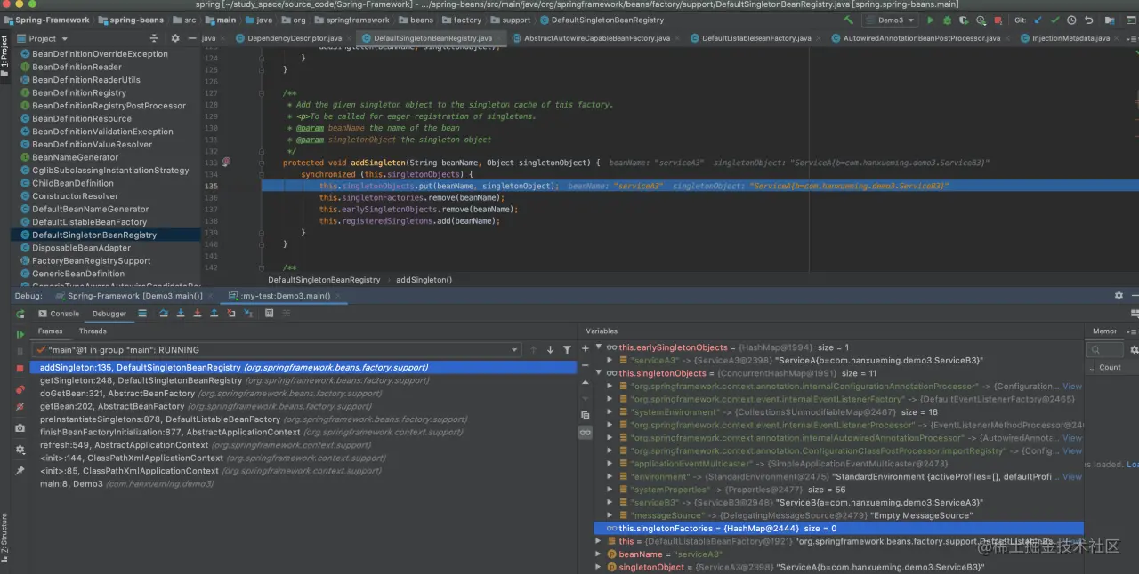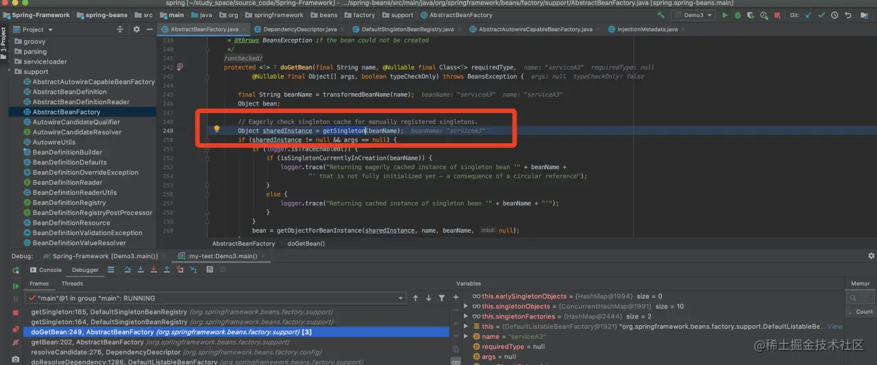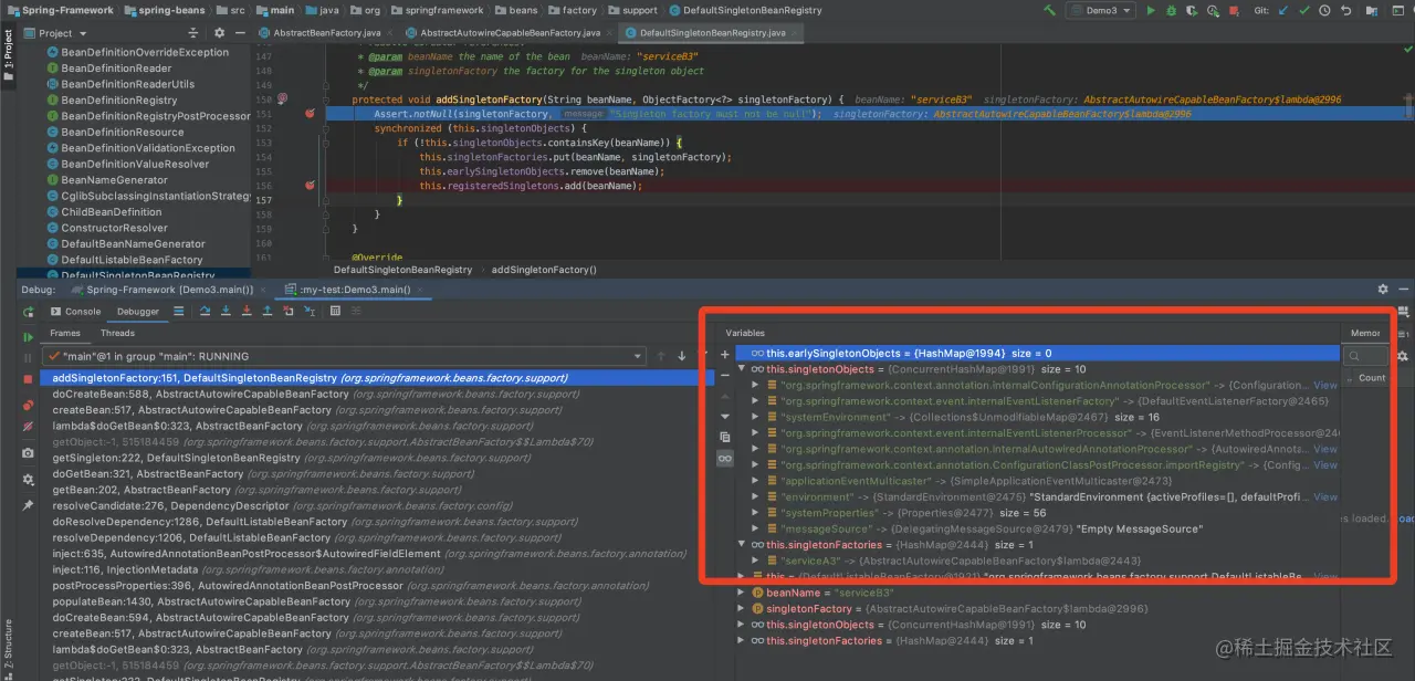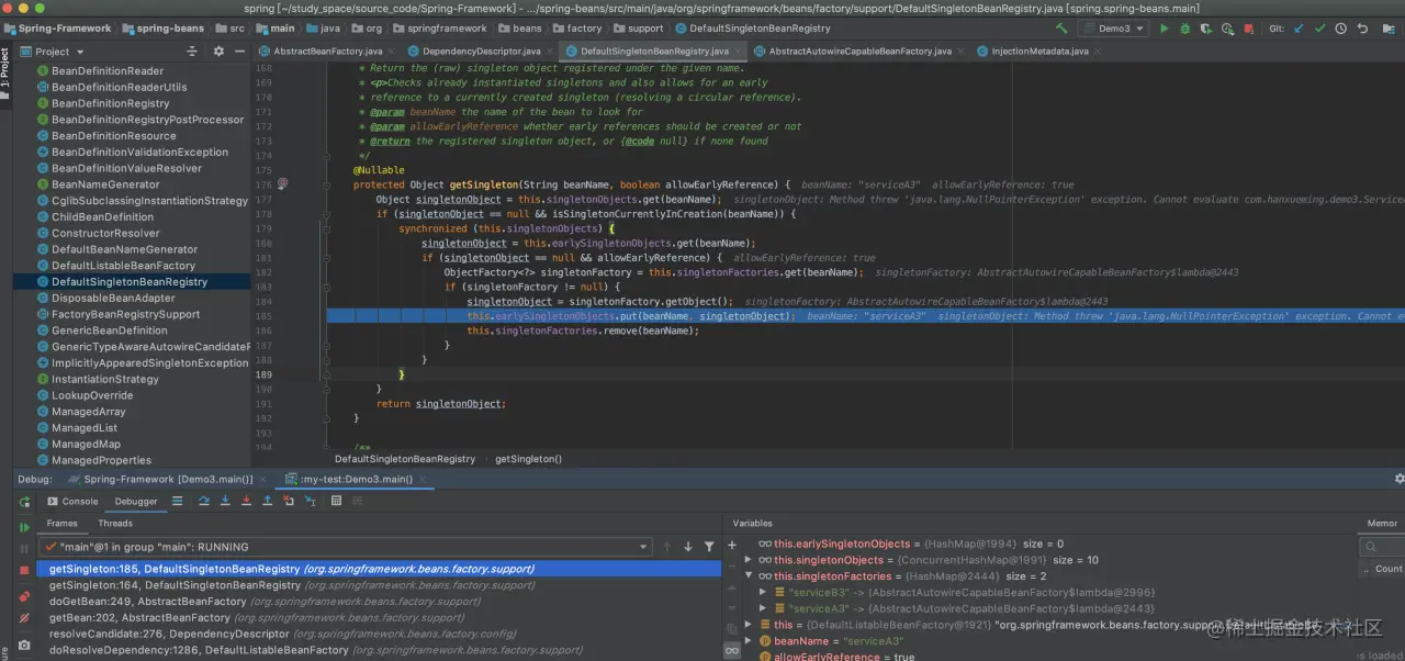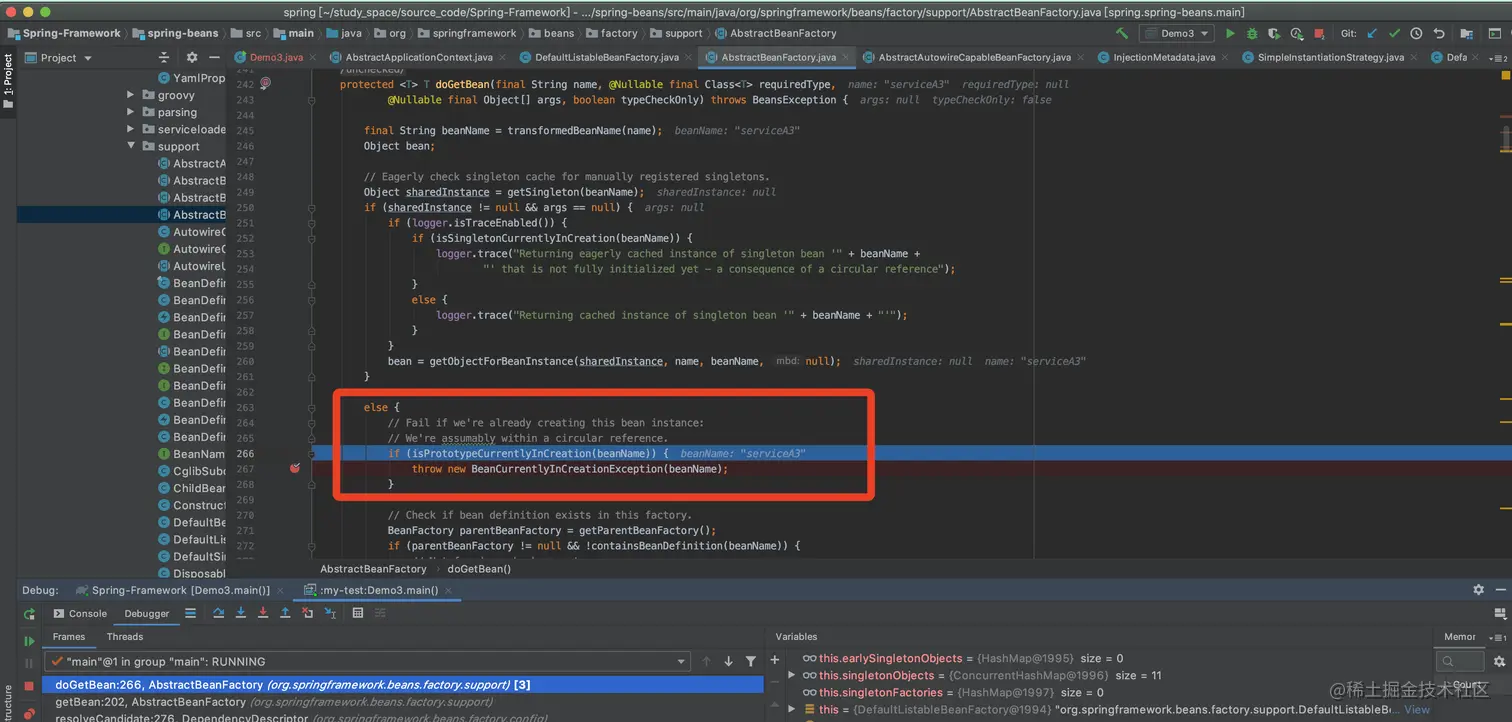 到这里,ServiceA3 和ServiceB3的实例已经成功创建,并放入到Spring的第三级缓存中,但是此时,还没有向ServiceA3 和 ServiceB3中注入属性。