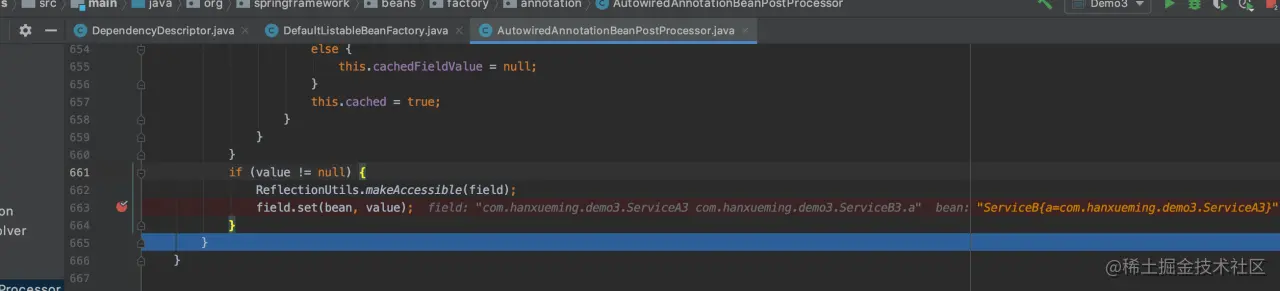 AutowiredAnnotationBeanPostProcessor在获取resolveDependency方法返回后,利用反射把ServiceA3实例注入到实例ServiceB3中