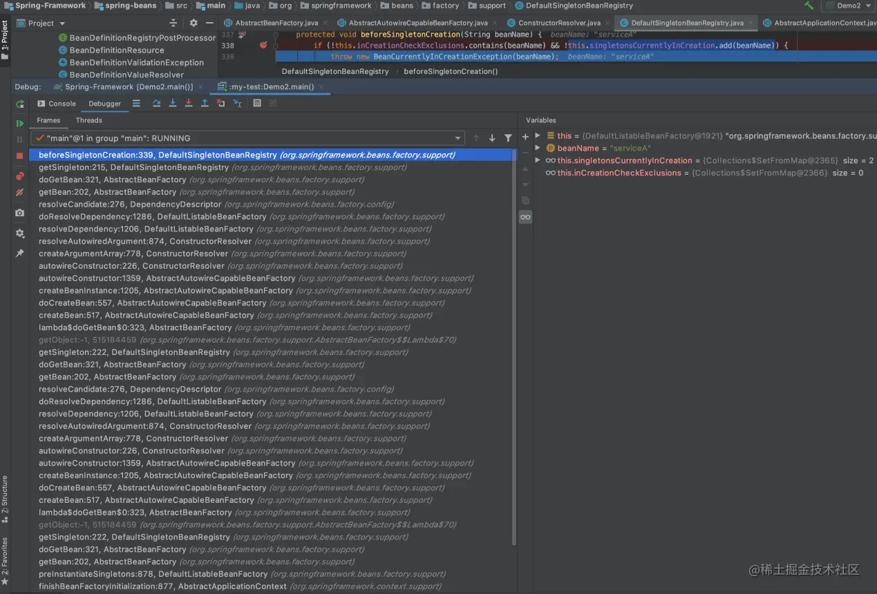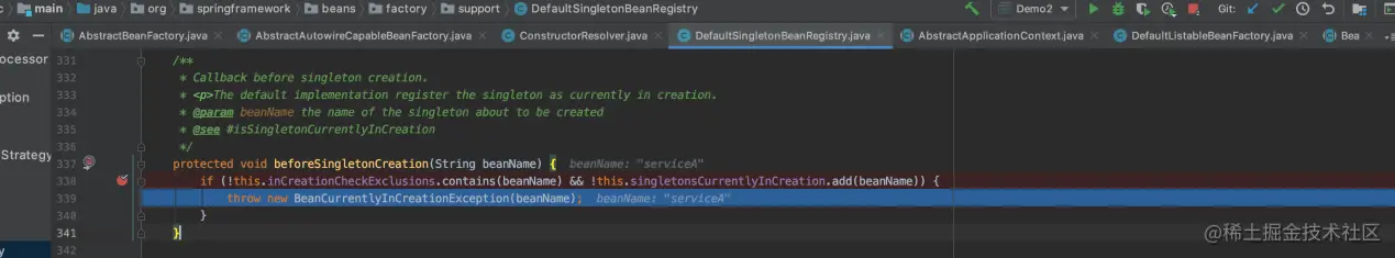2)检查singletonsCurrentlyInCreation中是否存在类的标识,如果存在则抛出BeanCurrentlyInCreationException(beanName),终止程序
