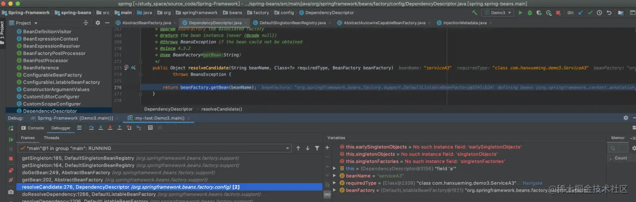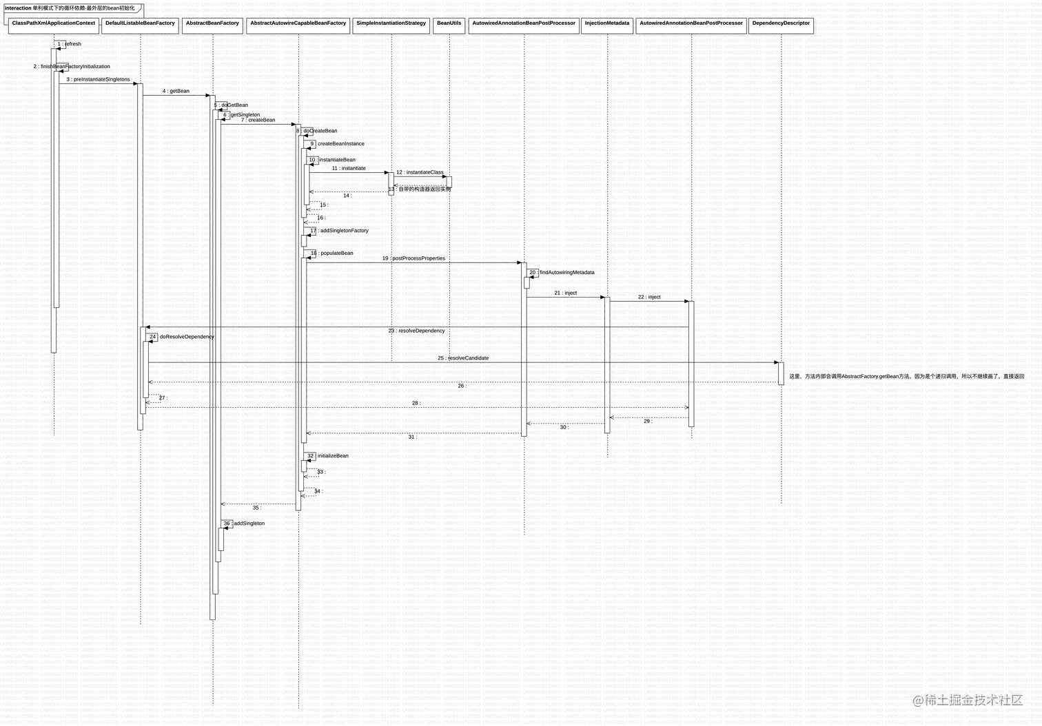 在时序图中提到: DependencyDescriptor.resolveCandidate中调用了AbstractFactory.getBean 获取属性的对象实例