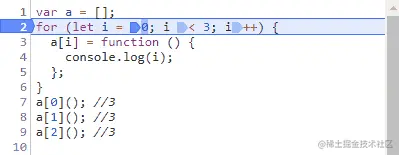我们猜测JS引擎在给我们解释for(let i = 0;i < 3;i++)循环的时候大致情况可能是这样才导致了形成了多个块级作用域。当然我觉得上面的代码用while来写更具说服力,但是我们这个只是模拟并不是要完全实现for循环。while方式的模拟: