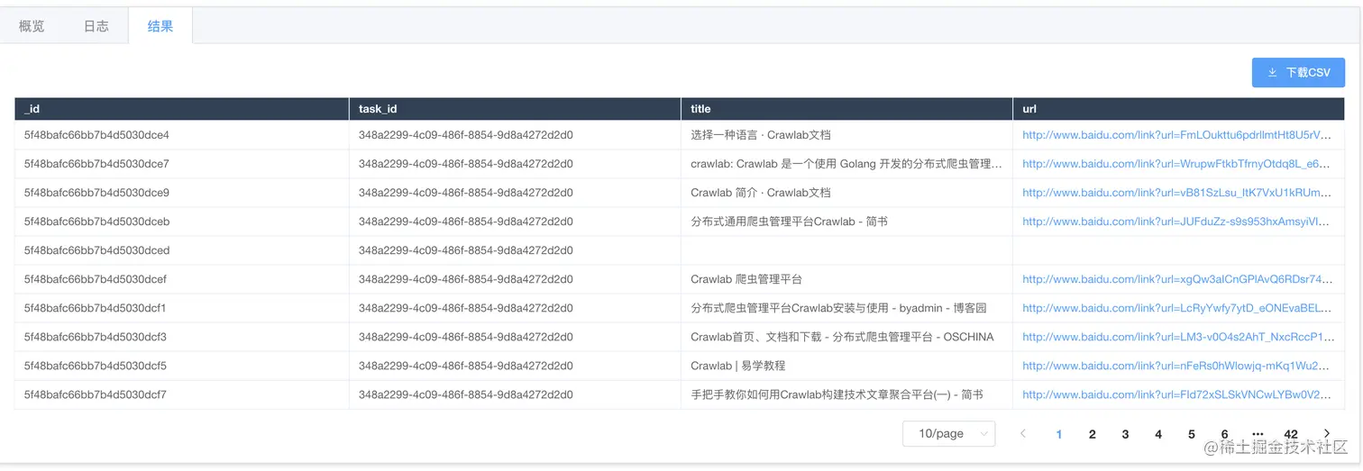 并且,我们还可以在 “结果” 中查看抓取到的结果数据。这些结果是默认保存在 MongoDB 数据库里的。