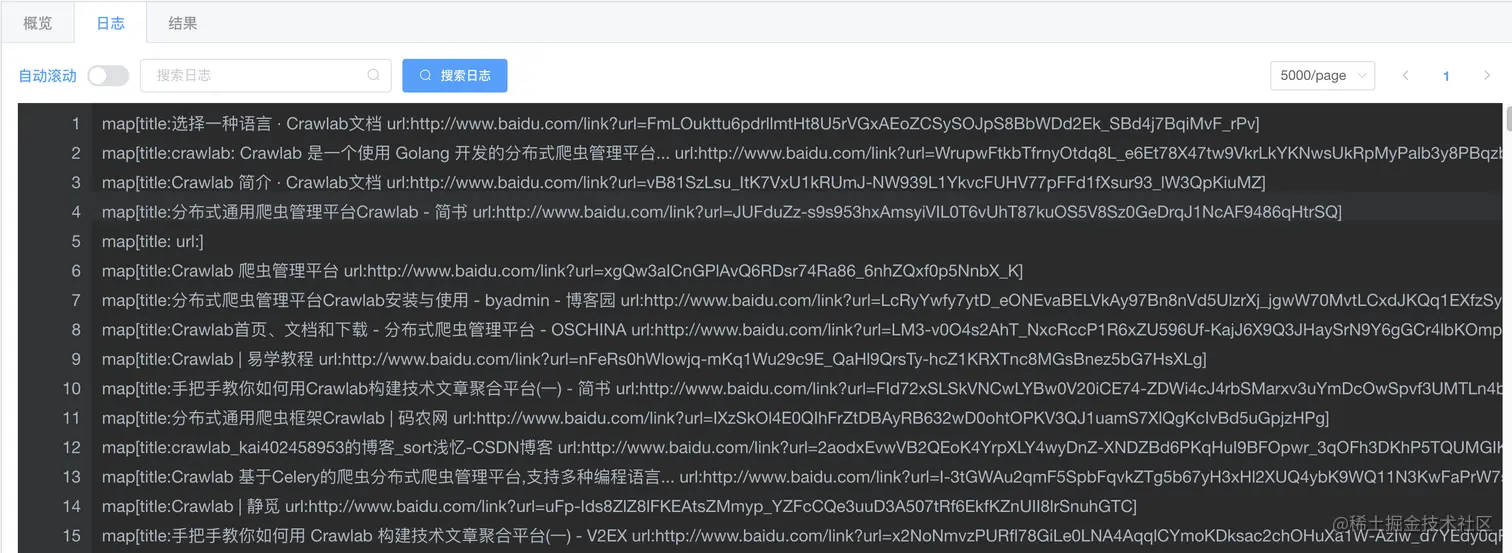 创建好之后,在所在目录执行 go run baidu_spider.go,即可运行百度搜索 “crawlab” 关键词爬虫。运行结果类似如下。