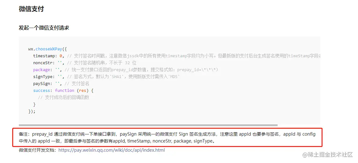 wx.config({ debug: false, nonceStr: nonce_str, appId: appid, signature: sign, timestamp: timeStamp, order_id: params.order_id, jsApiList: [ 'chooseWXPay' ] }) wx.ready(() => { wx.chooseWXPay({ timestamp: timeStamp, nonceStr: nonce_str, package: 'prepay_id=' + prepay_id, // 统一支付接口返回的prepay_id参数值,提交格式如:prepay_id=\*\*\*) signType, // 签名方式,默认为'SHA1',使用新版支付需传入'MD5' paySign, success: function (res) { // 支付成功后的回调函数 } }); }) wx.error(function (res) { Toast(res) });