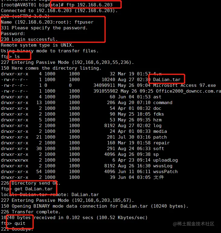 centos7 使用ftp命令获取文件 3wind 2020-08-28 3,807 阅读1分钟 使用ftp命令获取文件 1、将文件放置到ftp目录下 2、登录指定的ftp #进入到一个自己指定的目录,这里用/bigdata举例 cd /bigdata #输入ftp ip登录ftp服务器 ftp 指定IP #输入用户名密码登录 #登录成功后ls查看文件 ls #get 文件名获取对应的问题 get 对应文件的文件名称 #获取文件后quit退出ftp命令
