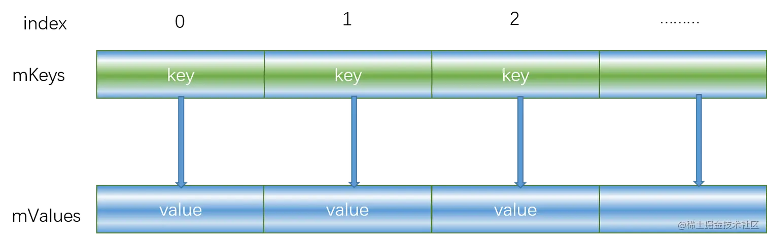 也是两个数组,存储数组索引的key,存储数据value,通过相等索引来映射;mKeys是从小到大有序存储的