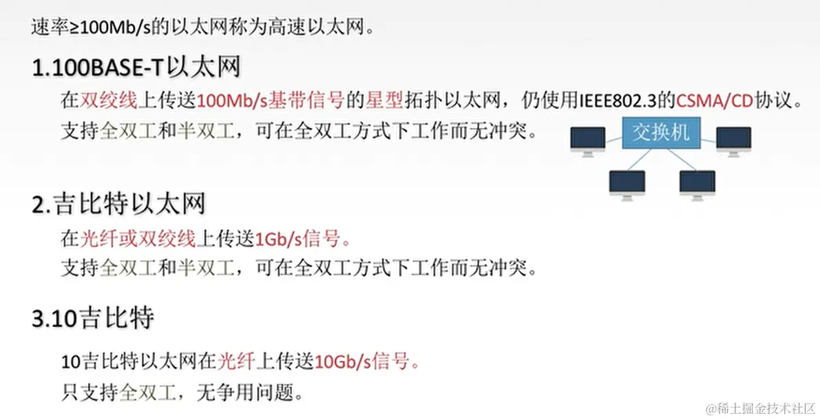 10BASE-T以太网:采用无屏蔽双绞线,传输速率为10Mb/s,物理上采用星型拓扑,逻辑上总线型,采用曼彻斯特编码,采用CSMA/CD介质访问控制