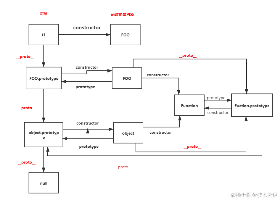 构造函数:用来初始化新创建对象的函数,Foo是构造函数,自动给构造函数赋予一个属性prototype,该属性指向了实例对象的原型对象