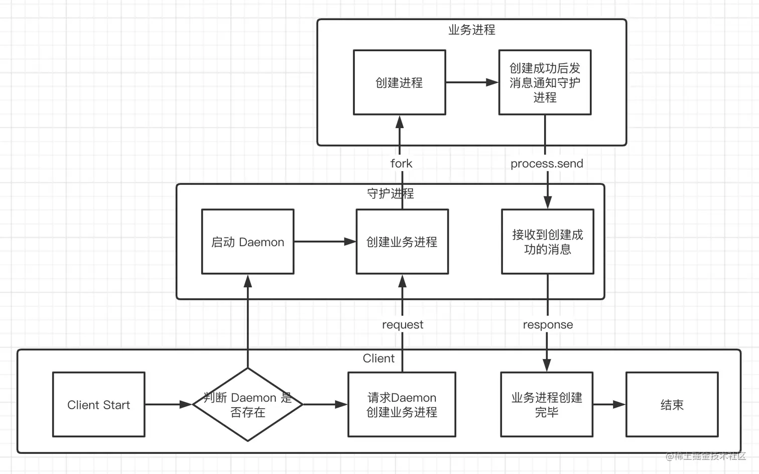 同时守护进程在接收到消息以后,也会重新创建新的进程,从而完成了进程自动重启的逻辑。