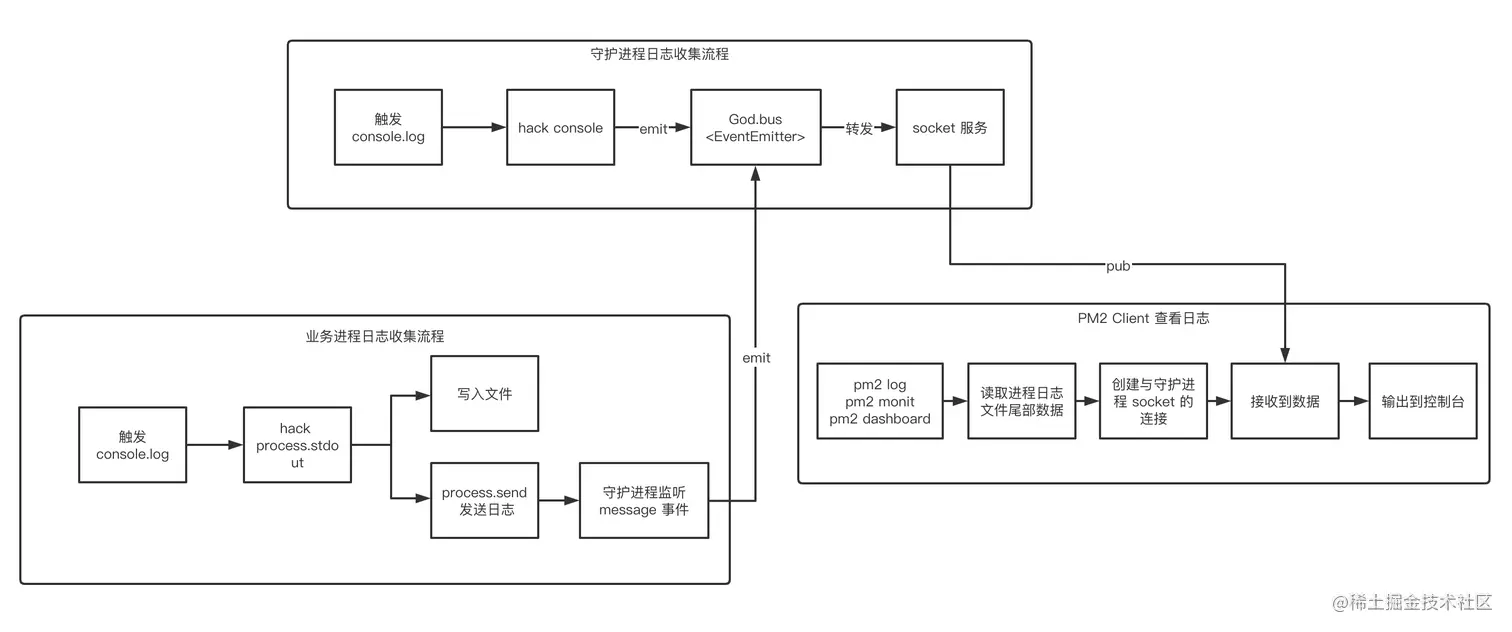 hack console 的位置:lib/Utility.js hack stdout/stderr write 的位置:lib/Utility.js 创建文件可写流用于子进程写入文件:lib/Utility.js 子进程接收到输出后写入文件并发送消息到守护进程:lib/ProcessContainer.js 守护进程监听子进程消息并转发:lib/God/ClusterMode.js 守护进程将事件通过 socket 广播:lib/Daemon.js Client 读取并展示日志:lib/API/Extra.js