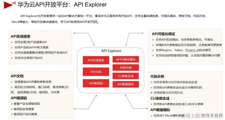 从华为云官网开发者资源工具下的API Explorer,可以获取华为云开放的2800+的API信息。这里汇聚了华为云服务所有开放的API,大家可以在这个平台上快速的查看和搜索、查看API文档、随时搜索API错误码,我们同时提供了在线可视化调试的功能,方便学习和掌握API的使用。