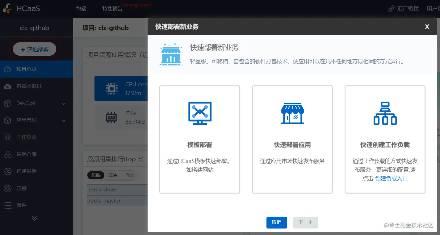 3、对于已使用容器的用户,通过快速部署按钮即可三步建站、或者部署一个应用