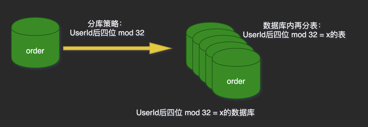 比如一个订单库,分库分表方案是32*32,即通过UserId后四位mod 32分到32个库中,同时再将UserId后四位Div 32 Mod 32将每个库分为32个表,共计分为1024张表。