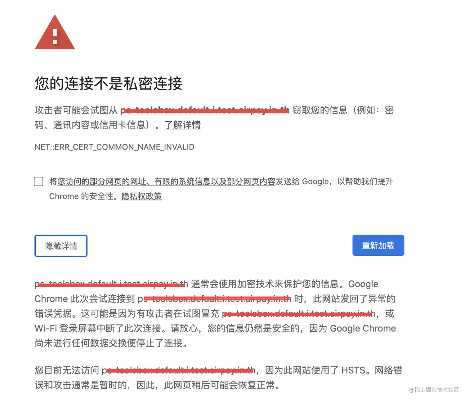 使用公司内部网页工具时,Chrome浏览器出现如图所以提示,捣鼓半天也打不开。但Safari浏览器是没有问题的。