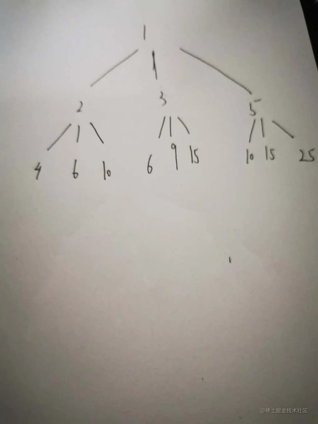 我们已1作为根节点,分别乘以 2,3,5。得到第一层数据,再分别乘以 2,3,5得到第二层数据。